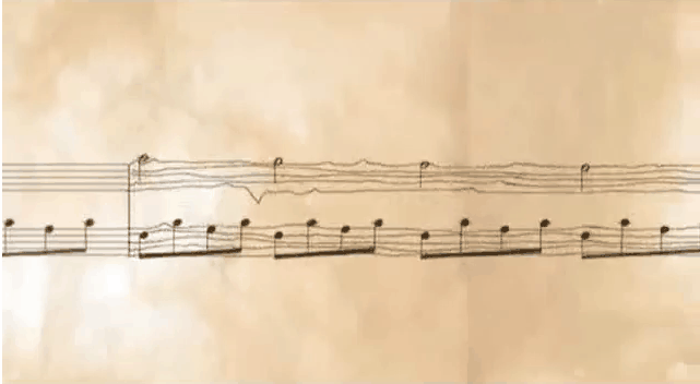 The film begins rather simply, both musically and visually, with the camera scrolling to the right along a sepia coloured musical score as we listen to the scored music being played on a keyboard. Soon some cacophonic noise can be heard in the background and the musical bars begin to quiver. As the noise, which sounds like the static of a radio being tuned gets louder, so does the disturbance of the lines and notes of the musical score. More city noises (a siren, an announcement in a station, a recorded voice speaking in English) take over and Yoshida illustrates this with abstract images in the same inky pen as the musical score.