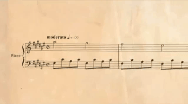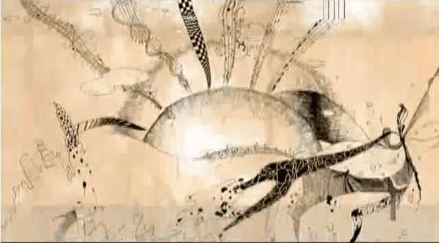 All the while, the camera continues at the same pace to pan towards the right as if the viewer were a musician reading the score. A synthesizer joins the cacophony, and as the music takes a funkier change of pace, the camera follows the ink as it moves downwards into new uncharted territory creating more and more elaborate designs as it goes. The motif of the bars of music are interwoven with the more abstract imagery throughout giving the image flow and continuity. The animation climaxes into an ecstasy of visual imagery, then gently returns to the original score in a visual and aural coda, ending with a copyright notice similar to that at the end of a musical score.