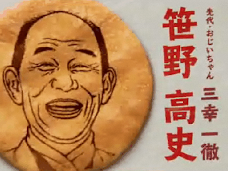 Sasano's face imprinted on senbei for a Sanko-Seika campaign