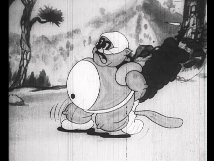 While watching Shinsetsu Kachi Kachi Yama, I was reminded of Steamboat Willie (1928).... and not just because of the attempt at coordination of music and animation.  In the screencap of Steamboat Willie below, notice the body shape of the 'bad' character Captain Peg-Leg Pete: