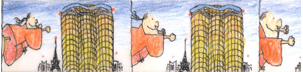 Furukawa employs his familiar doodling style drawn animation, which is influenced by the style of his mentor in the 1960s Yōji Kuri and the New Yorker caricaturist Saul Steinberg, to depict an older couple on the train to Tokyo to visit their children. In addition to being a humorous take on an Ozu story, Furukawa also gives a nod to silent film comedies, but using a rollicking score similar to that played during silent movies and using bilingual (Japanese / English) title cards to impart story information.