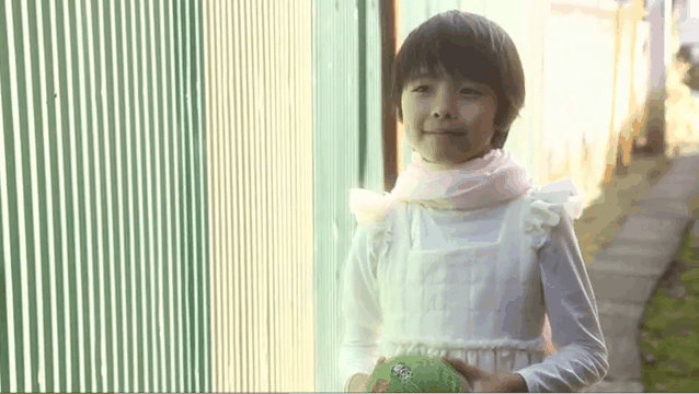 Kotaro (played by Ren Yasuda) is a very masculine type. His hair is shorn short, he wears masculine clothes and he likes to play with toy soldiers.