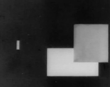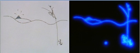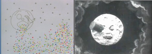 In the climactic point of this sequence, the man blasts off into outer space with the rocket ship landing in the eye of the moon in a visual reference to Georges Méliès’s pioneering film A Trip to the Moon (Le voyage dans la lune, 1902). Coloured shapes burst like confetti from the mouth of the moon and the sequence of events appears backwards at an accelerated speed with a black background replacing the white and neon-bright coloured lines replacing the black lines (see comparison above).